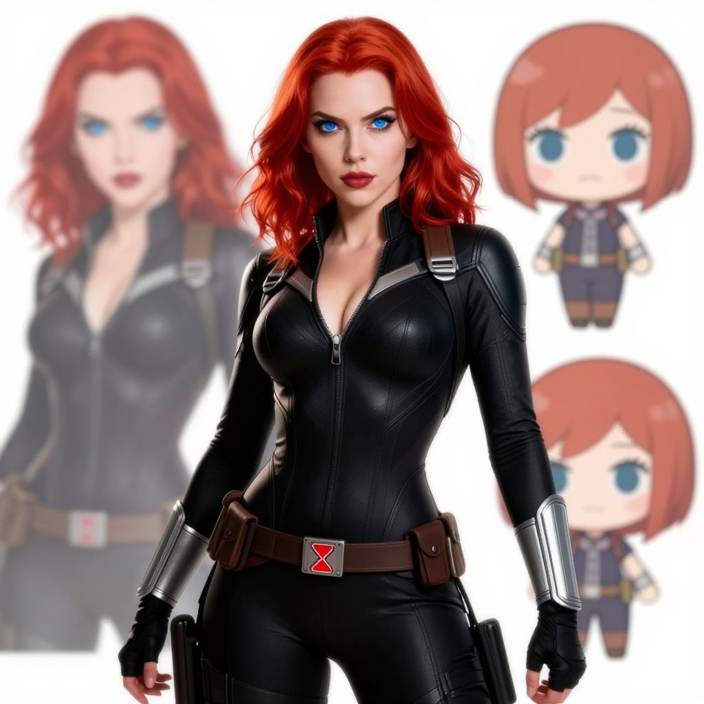 Digital anime-style illustration of a female character inspired by Black Widow from Marvel. The character has vivid red hair, striking blue eyes, and is dressed in a sleek black bodysuit with a utility belt featuring a red hourglass symbol. The artwork emphasizes the character's confident pose and detailed facial features, combining both realistic and chibi stylized versions in the background.