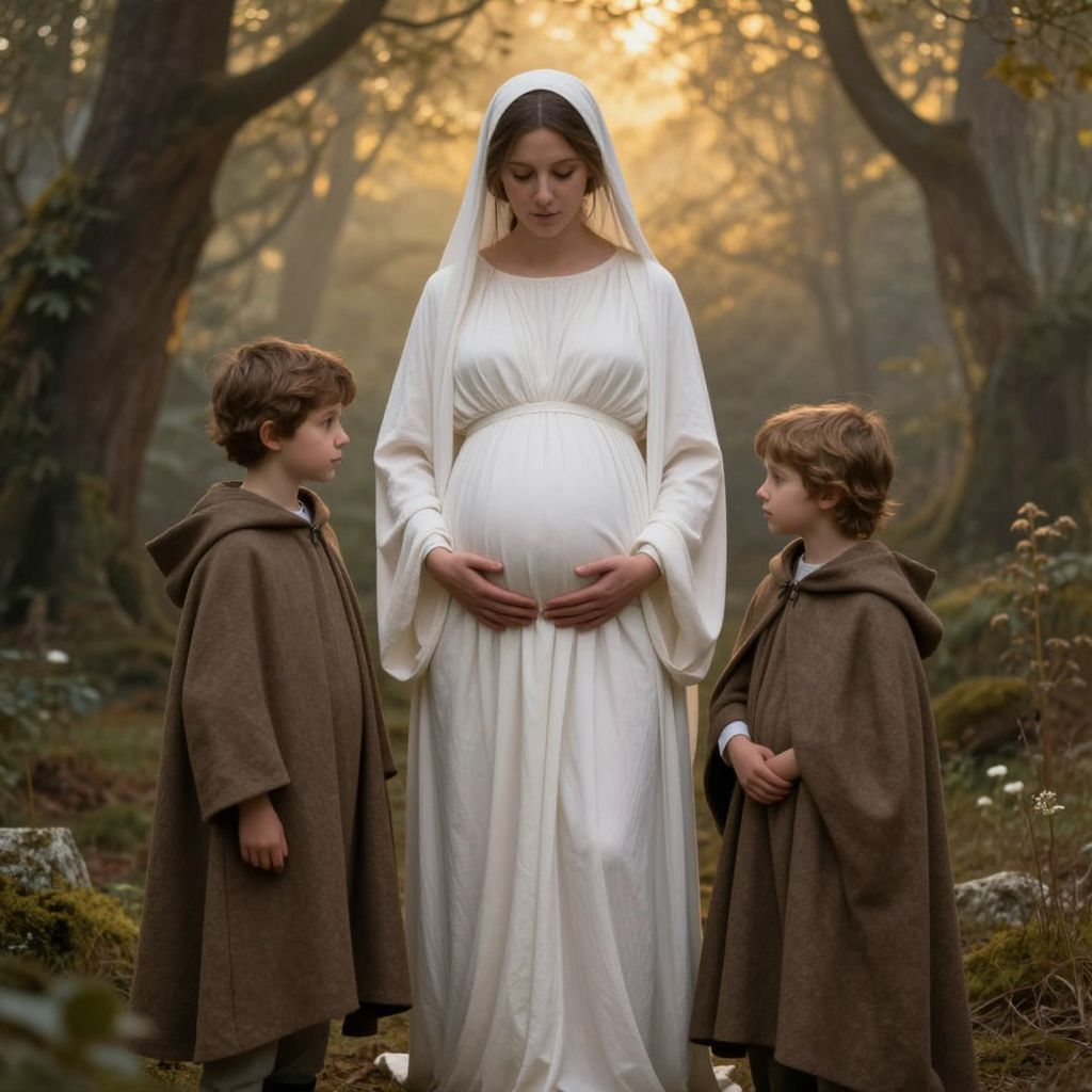 A serene digital artwork reminiscent of James Tissot's style depicts a pregnant woman in a flowing white robe, flanked by two children in matching brown cloaks, set against a mystical forest backdrop with golden-hour lighting, evoking a timeless and ethereal atmosphere.