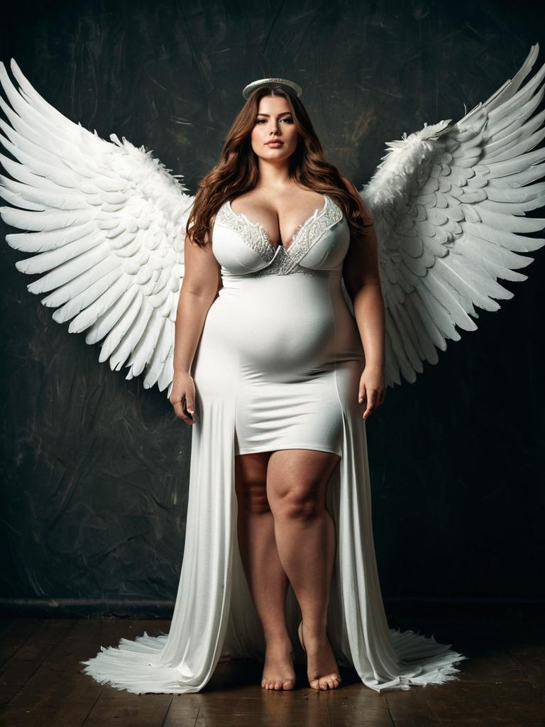 Full body portrait of a plus size woman posing as an angel wearing a long white dress with a deep neckline, large feathered white angel wings, and a halo. She has long brown hair, is barefoot, and stands confidently against a dark textured background.