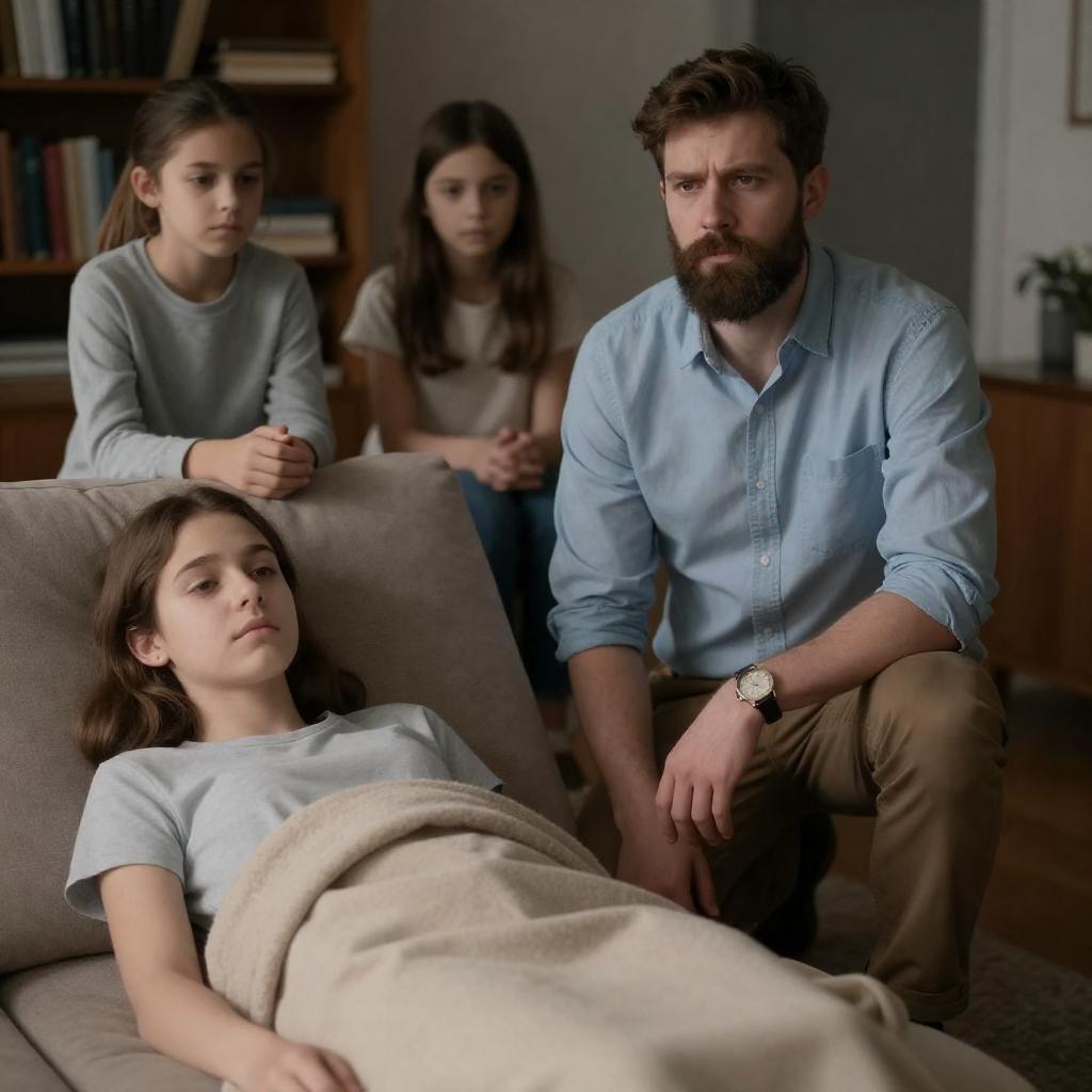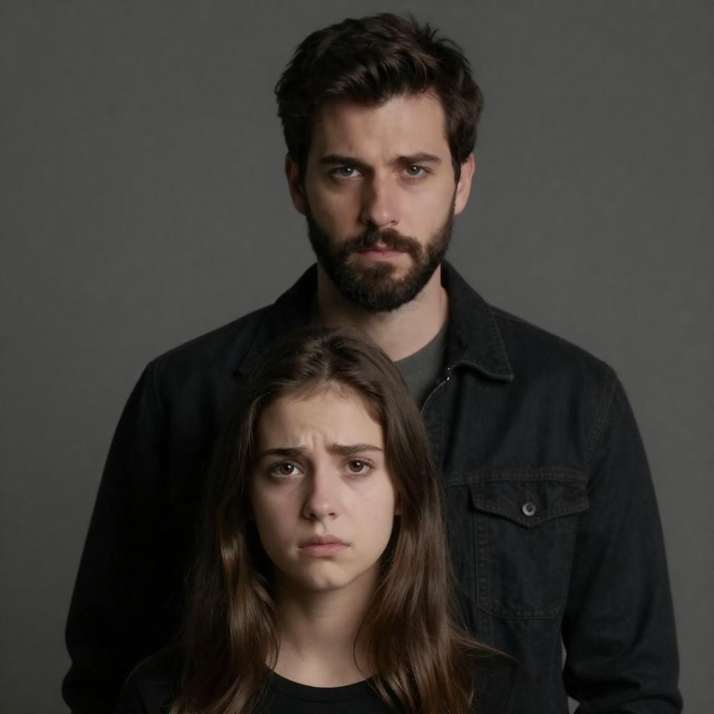 Photograph of a serious-looking man with dark hair and beard standing behind a young woman with long brown hair and a concerned expression. Both have fair skin and are dressed in dark clothing. The background is blurred and gray. The man's intense gaze contrasts with the woman's worried look.