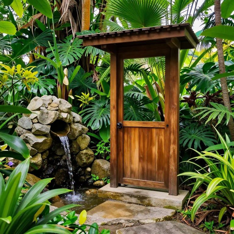 Photograph of a wooden door set in a lush, tropical garden with a small waterfall cascading from a rock formation.