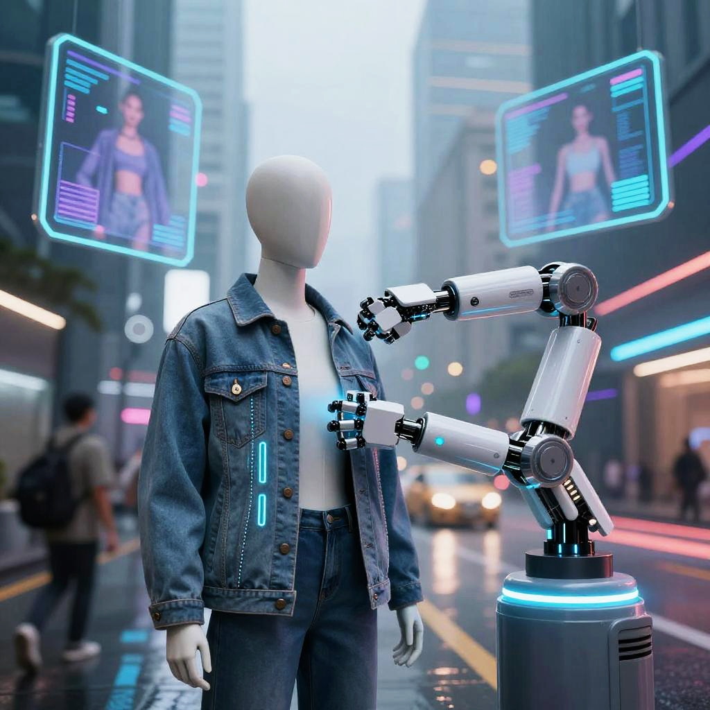 AI clothing changer technology depicted as a robotic arm rapidly swapping clothes on a model, futuristic urban background with glowing screens, dynamic motion blur effects, neon lighting, showcasing smart textile materials and digital fashion trends