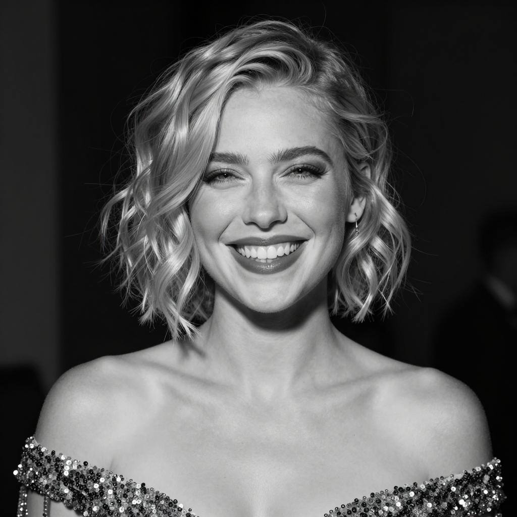 Woman with short, wavy brown hair and bangs, wearing a white, one-shoulder, ured dress with a large bow, and dangling earrings. She smiles slightly. Background includes several people in plaid shirts and yellow jackets, standing closely. Warm, dim lighting.