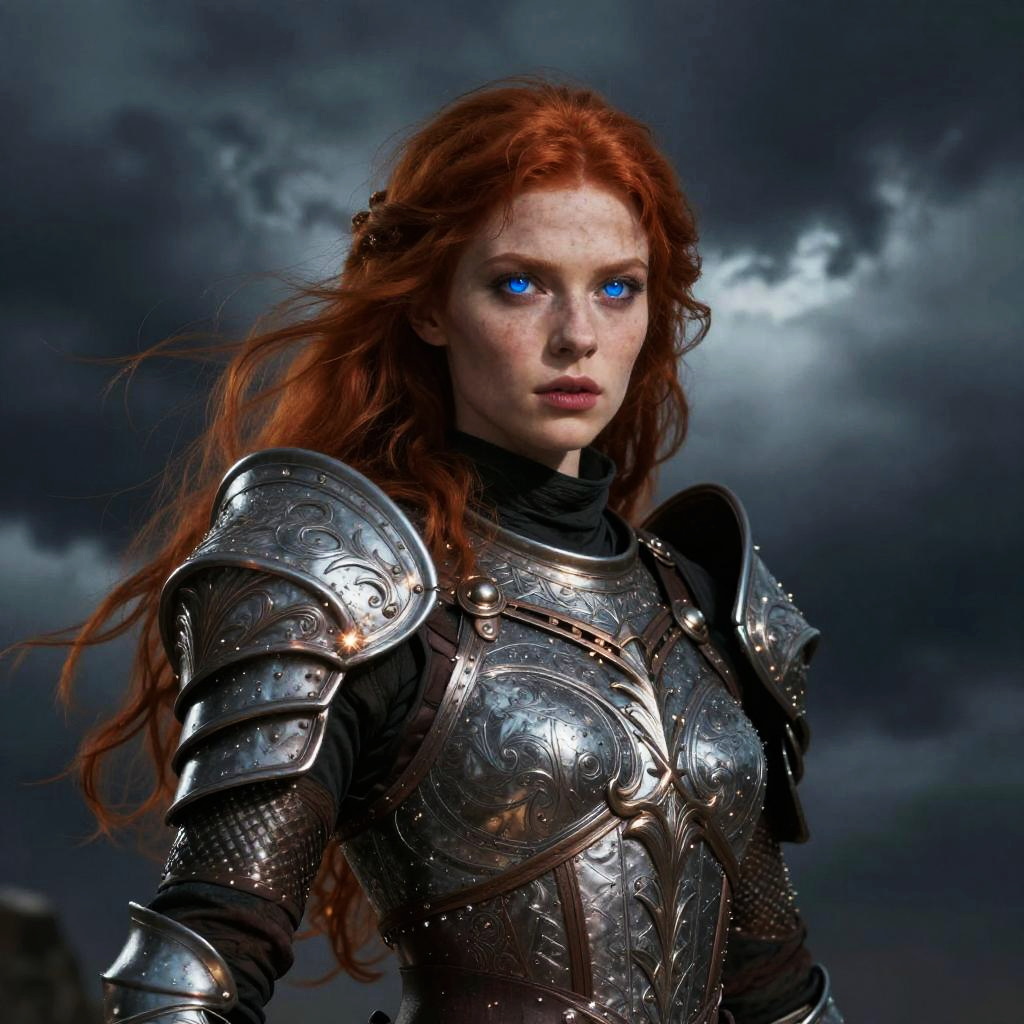 Photograph-like CGI image of a fair-skinned, red-haired woman with striking blue eyes, wearing intricate, silver metallic armor with detailed engravings. Her long hair flows freely, contrasting with the dark, stormy sky in the background. The armor covers her chest and shoulders, reflecting light, highlighting its elaborate patterns. Her expression is stern and determined. The overall mood is dramatic and heroic, with the dark clouds adding a sense of impending action. The image emphasizes her strength and warrior-like presence.