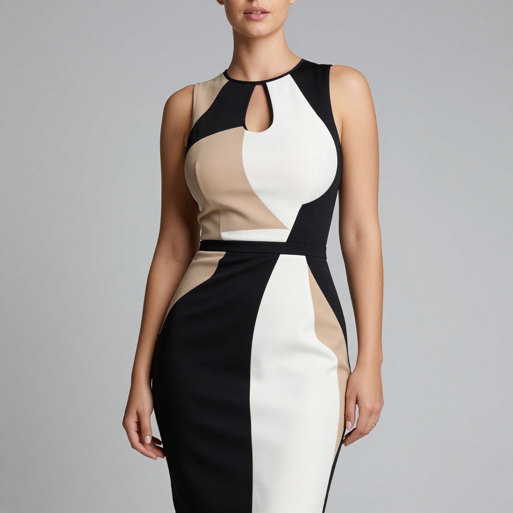 "Woman, avant-garde, asymmetrical knee-length dress with color block design in black, white, and tan, geometric patterns, sleeveless style, high neckline with keyhole cut-out, fitted silhouette, simple gold bangle on one wrist.. Sexy. Pretty face and beаutiful eyes. Big breasts."