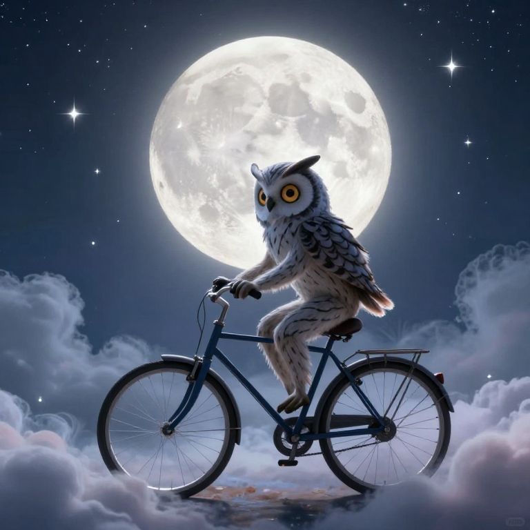 Whimsical Owl Riding Bicycle in Moonlight