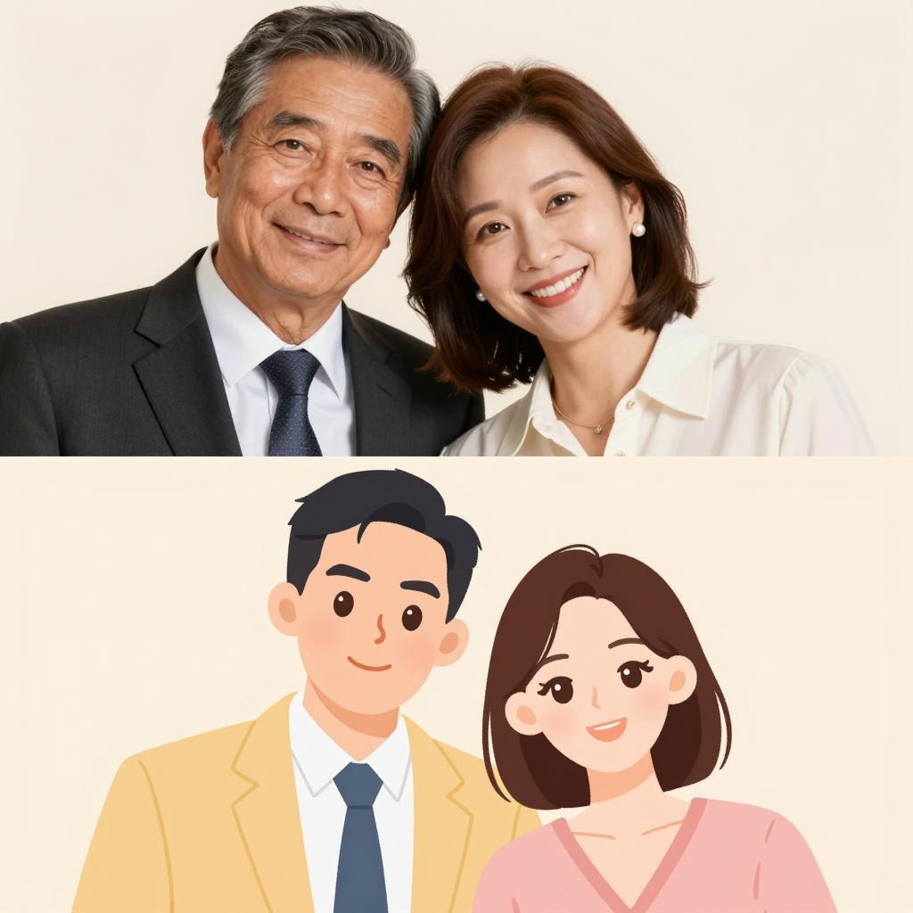 Family photograph. Six people standing against a plain white background. Father in gray suit, left, with hand to chin. Mother in black blazer and white top, center. Two sons, left son in blue sweater, right son in gray sweater. Daughter in red dress, front center, clapping hands. Elderly woman in white cardigan and plaid skirt, right. Elderly man in black suit, second from right, smiling. All smiling. Father on left, children and mothers in center, elderly woman and man on right. Standing in a line.