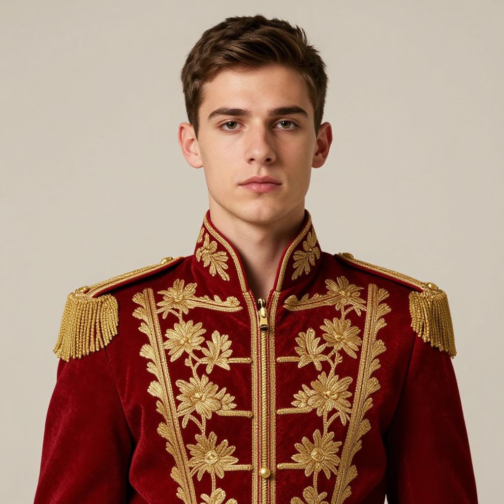 A young man wears an intricately embroidered military-style jacket featuring gold floral patterns and red velvet accents. The portrait highlights his calm and confident expression against a simple, neutral background, emphasizing the regal and elegant details of the attire.