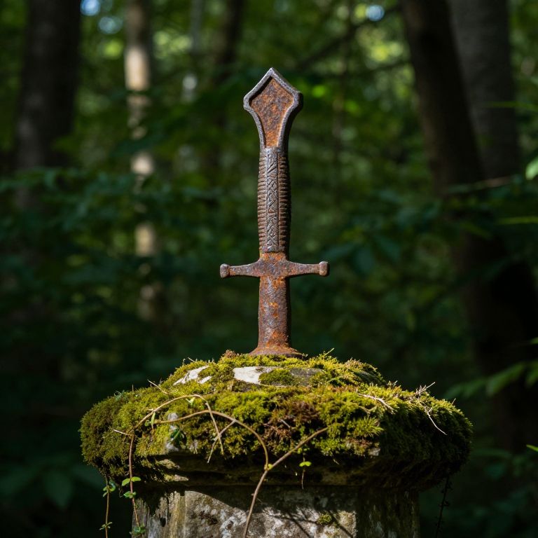 Ancient hilt embedded in moss and vines on a weathered stone pedestal, sunlight filtering through dense forest canopy, highlighting the rusted metal and faded engravings