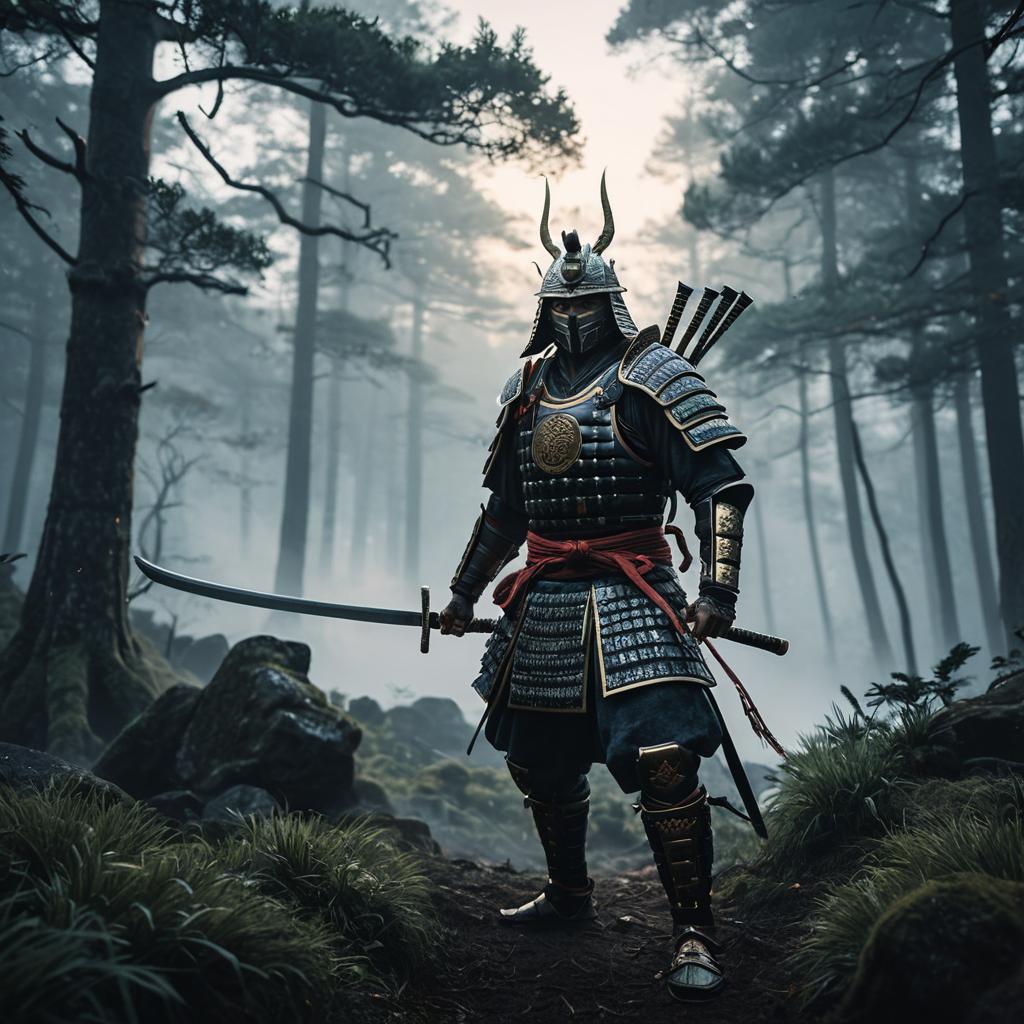 Samurai Warrior in Misty Forest at Sunrise