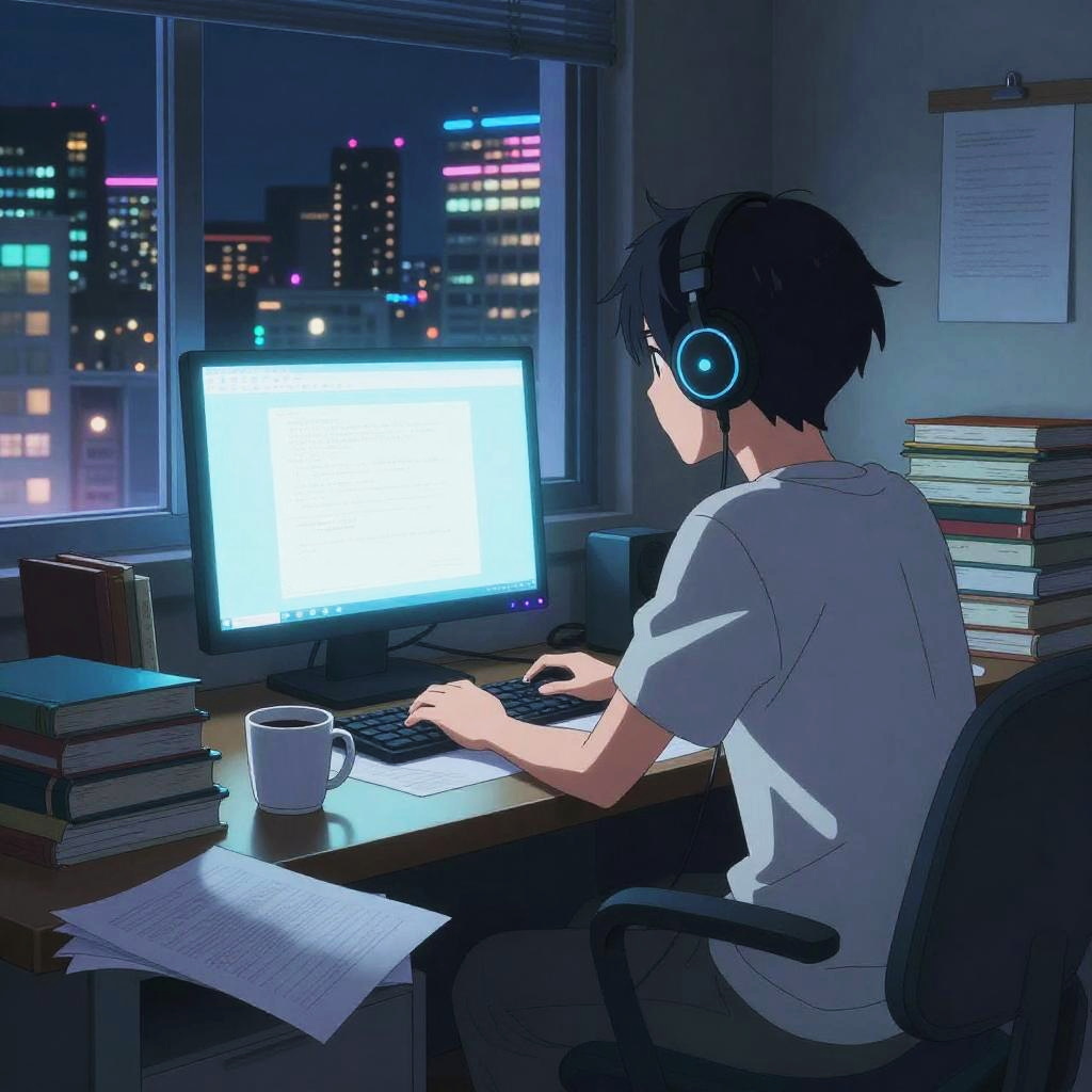 Anime-style digital artwork of a boy with black hair, headphones, white shirt, and gray shorts, writing at a sunlit desk, surrounded by books
