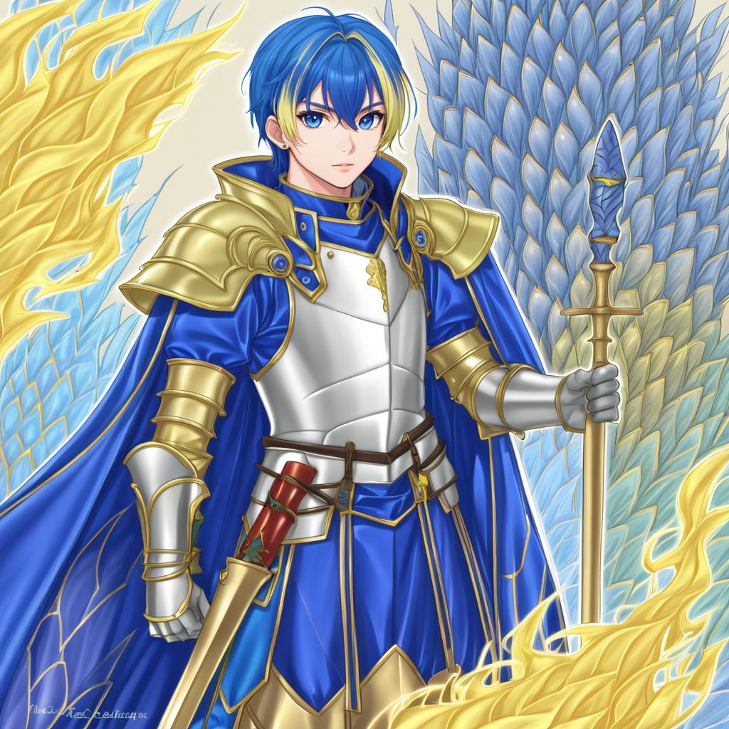 Alfonse (fire emblem), fire emblem, 1boy, rabbit ears, blue eyes, blue hair, blonde hair, two-tone hair, scale armor, gloves, cape, by artist jack dempa, anime