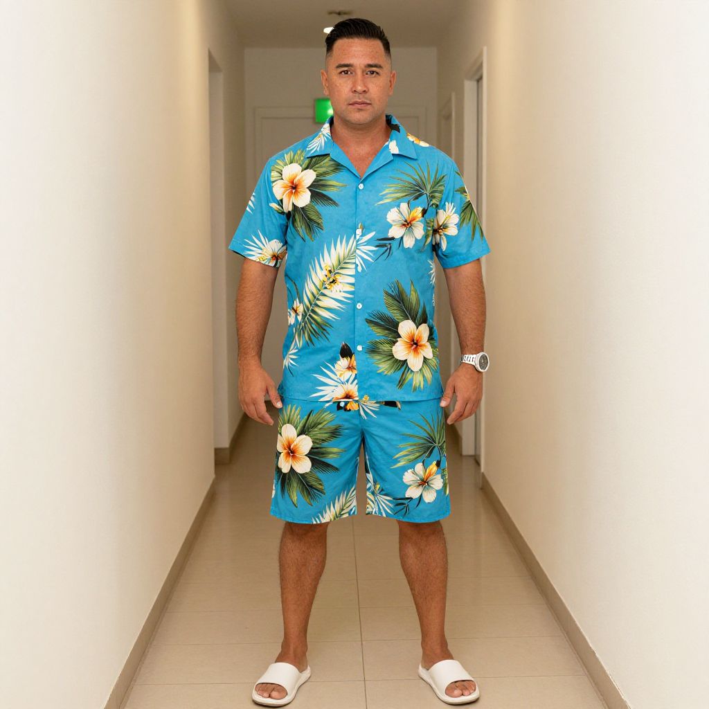 Man Tropical Outfit Costume, a man in a hawaiian shirt and shorts stands in a hallway