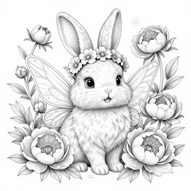 The image is a highly detailed, black-and-white contour line drawing of a magical, cute white fairy rabbit with a happy smile and big, fairy-like eyes. The rabbit's shiny, snow-white fluffy fur is textured with fine lines, giving it a lifelike appearance. It is adorned with a crown of delicate flowers, adding to its fairy-tale charm. The rabbit is surrounded by a variety of peony flowers, which are intricately drawn with detailed petals and stems, creating a lush, garden-like setting. The flowers are arranged in a natural, organic manner, with some in the foreground and others in the background, creating depth and a sense of space. The overall composition is balanced, with the rabbit centrally positioned and the flowers framing it, creating a harmonious and enchanting scene. The image is rendered in a super wide angle, filling the frame with the rabbit and its floral surroundings, emphasizing the magical and whimsical nature of the scene. The high-definition, lifelike quality of the drawing captures the intricate details of the rabbit's fur and the delicate petals of the flowers, making the image appear almost three-dimensional.
