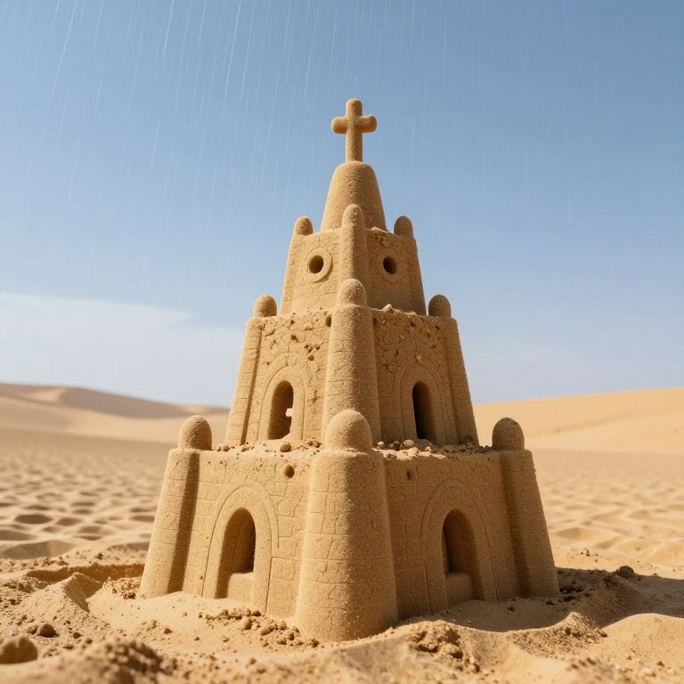 Upside-down sandcastle stands defiantly in a desert landscape, its golden tiers and cross-topped spire defying gravity as rain streaks downward against a clear sky, symbolizing resilience amidst the surreal beauty of a dreamlike world.