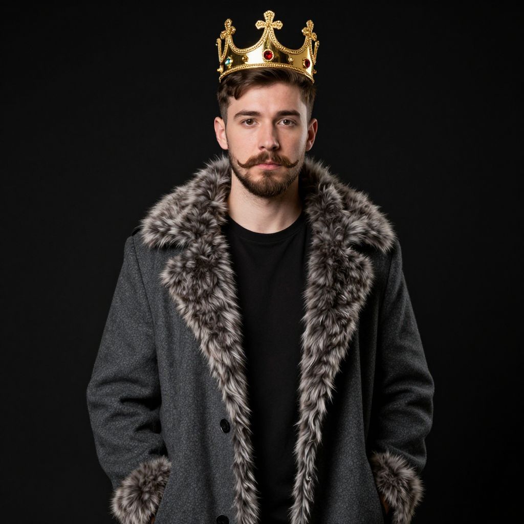 King clubs costume, 1boy, crown, male focus, solo, facial hair, black background, mustache, coat, looking at viewer, simple background, beard, fur trim, hands in pockets, upper body