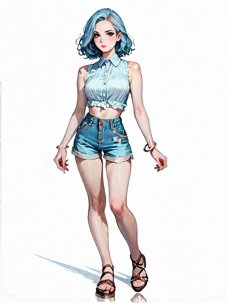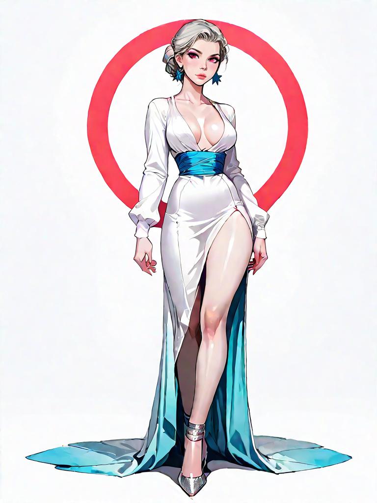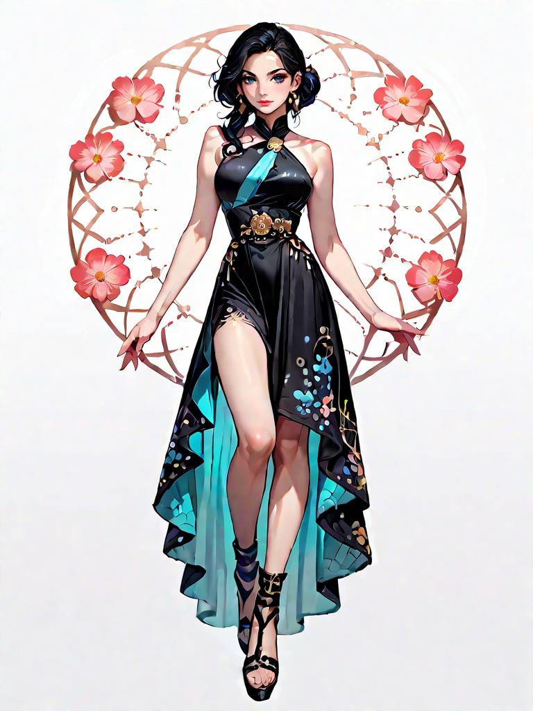 1girl, source_comics, realistic face, full body shot, Woman, modern minimalist, sleeveless shift dress in bright yellow, round neckline embellished with black beading, thigh-length hem, subtle bracelet, grey studio background