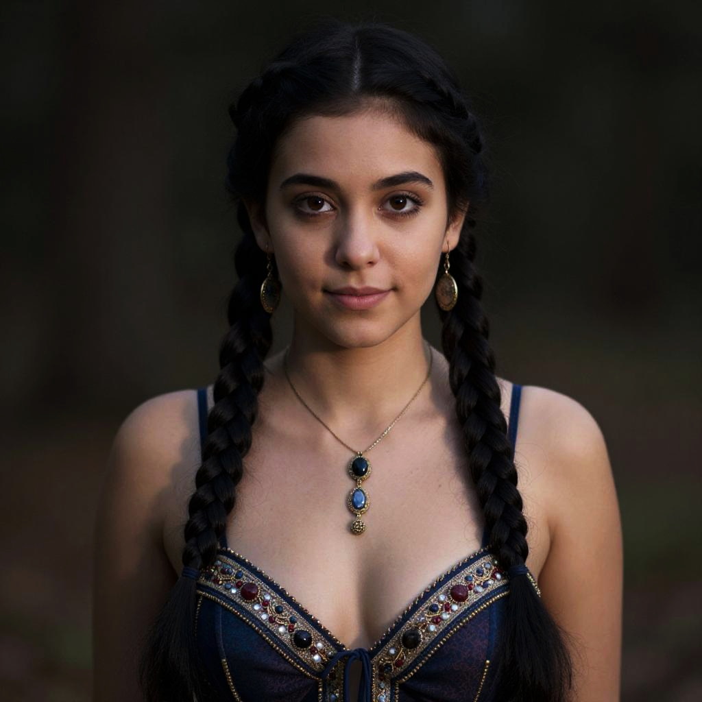 Detailed and realistic portrait of beautiful (KateKuray), sexy, 21 yo, brown_eyes, blurry, medium_breasts, cleavage, black_hair, braid, hair_over_shoulder, long_braid, long_hair, looking_at_viewer, solo, twin_braids, closed_mouth, lips, smile, jewelry, wearing a dress, shot outside, soft natural lighting, portrait photography, magical photography, dramatic lighting, photo realism, ultra-detailed, intimate portrait composition, Leica 50mm, f1. 4