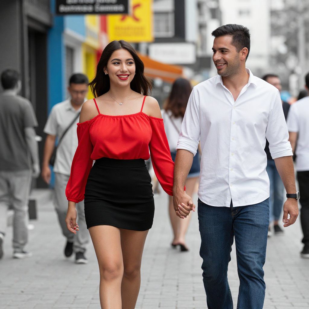 A couple, vibrant city street, black skirt, color pop, selective color, striking focus, woman in black skirt, red blouse, man in white shirt, blue jeans, holding hands, walking, smiling, bright background, muted surroundings, vivid accents, sharp details, lively atmosphere, dynamic pose, joyful expressions, urban setting, colorful storefronts, bustling crowd, contrast highlights, modern vibe Sexy. Pretty face and beаutiful eyes. Big breasts