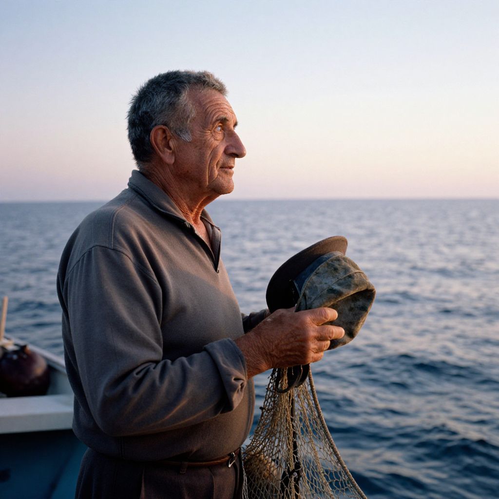 Craft a photorealistic portrait photograph using a film camera in the fine art photography style, showcasing an aged fisherman with deeply etched wrinkles and gentle blue eyes gazing out to sea from his modest fishing vessel. Capture this scene during sunrise, where soft golden light highlights the subject's lined face and hands as he clutches an old, weathered hat and a worn net. The expansive horizon where ocean meets sky serves as a backdrop, evoking solitude and reflection on life's journey. This portrait captures the essence of a Mediterranean man who has navigated turbulent waters and emotional challenges for decades, exuding a profound connection to nature and the passage of time.