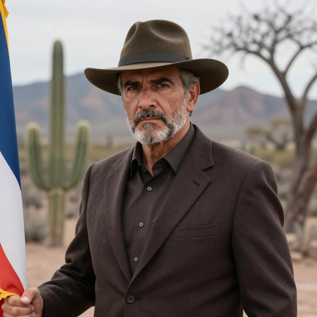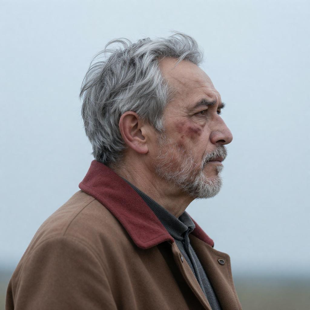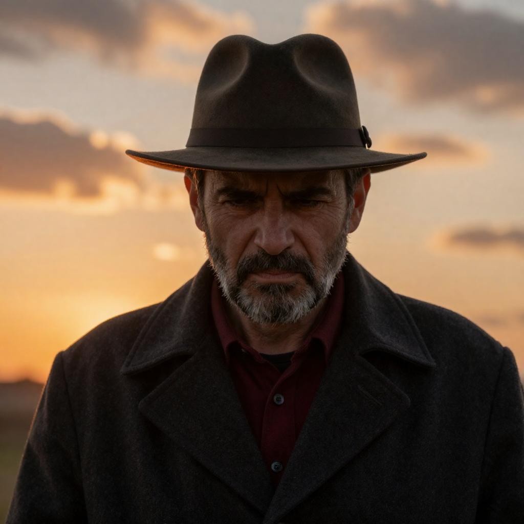 Photograph of a middle-aged man with a graying beard and mustache, wearing a brown wide-brimmed hat, dark wool coat, and red shirt. He looks down with a slightly grimaced expression. Background has a dramatic sunset sky with orange and yellow clouds. Man's face is slightly wrinkled, with visible lines and furrowed brows.