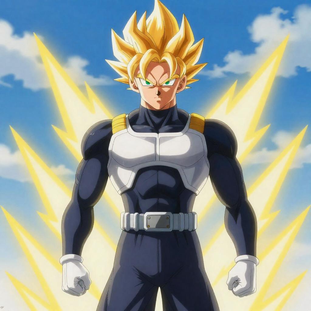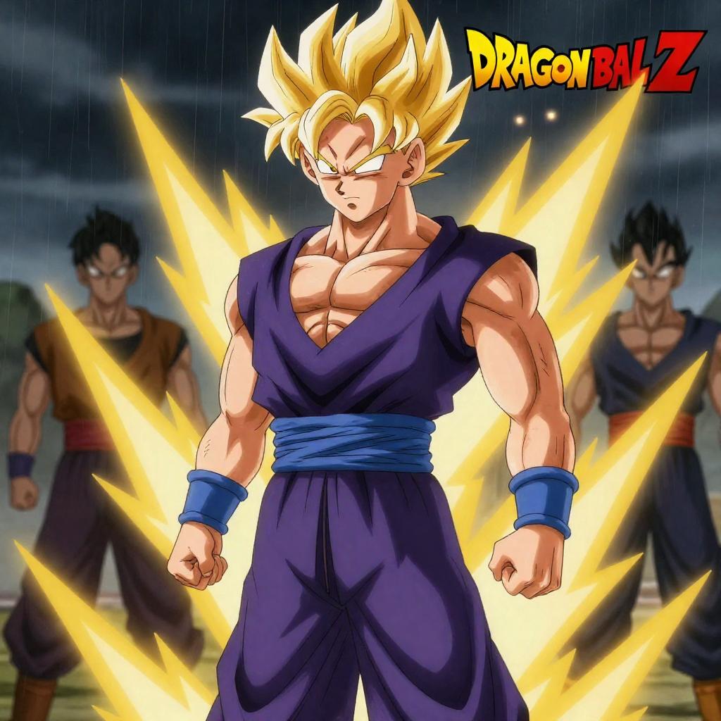 Two anime-style characters mid-battle. Green-haired character in purple and white outfit with flowing cape, intense forward motion. Opponent in yellow and blue outfit, determined expression, arms raised. Bright, dynamic background with explosive orange and yellow patterns.