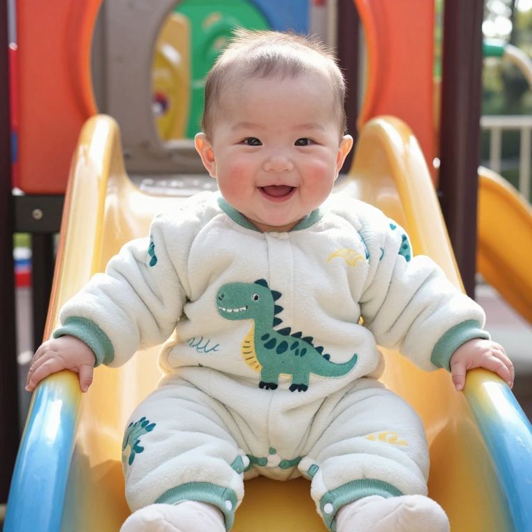 A joyful, natural-looking photo of a baby in a cute, oversized infant jogging suit with a dinosaur print, sitting on a colorful playground slide, surrounded by toys and colorful flags, morning sunlight, bright environment, baby's face showing pure joy, wide eyes, smooth round face, small nose, soft pink cheeks, in a wholesome family playground setting