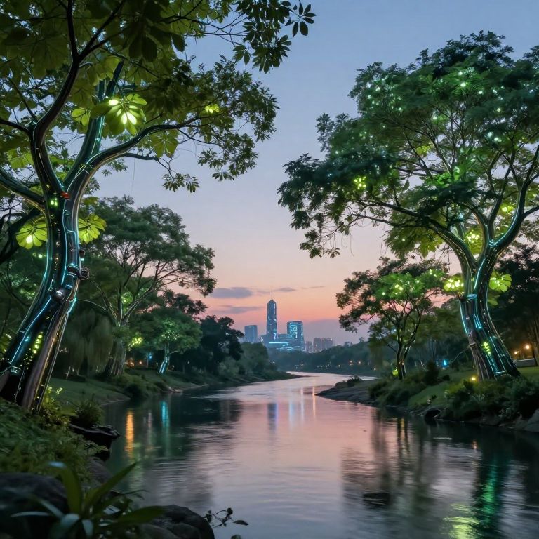 Pxiv serene landscape blending technology and nature, cybernetic trees with glowing leaves under a twilight sky, gentle river reflecting lights from distant futuristic buildings, peaceful and harmonious fusion of organic and digital elements