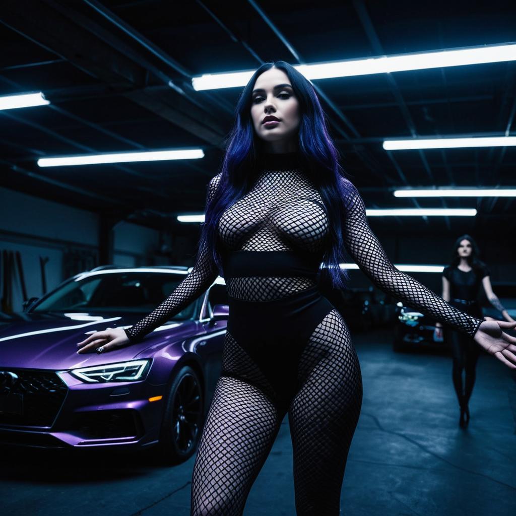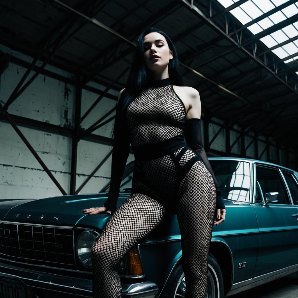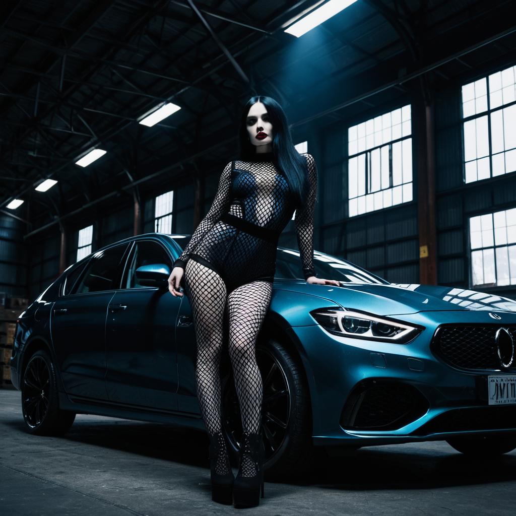 Sheer fishnet gothic dress layered over matching bodysuit in inky black with cool blue highlights on tan-skinned figure with smoky eye makeup and dark wavy hair posed standing between cars with arms outstretched, low-angle view in dark industrial warehouse with exposed ceiling beams and metal structures, dramatic blue-tinted cinematic lighting with strong shadows, high-fashion editorial photography, low angle, intense atmosphere, high resolution, ultra-detailed
