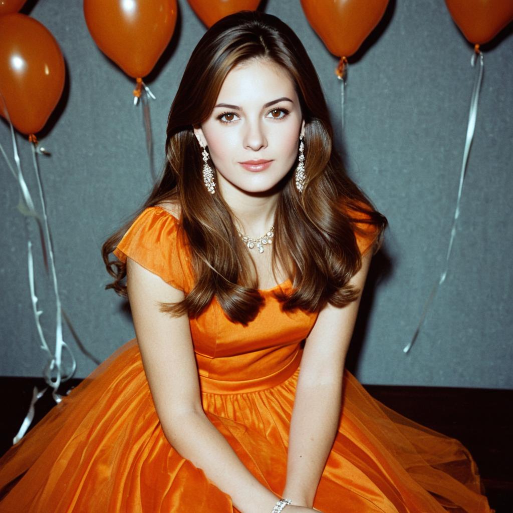 Portrait of a young woman with long brown hair wearing an elegant orange birthday dress. She is accessorized with sparkling earrings and a matching necklace. The background features orange balloons with silver ribbons, creating a festive atmosphere.