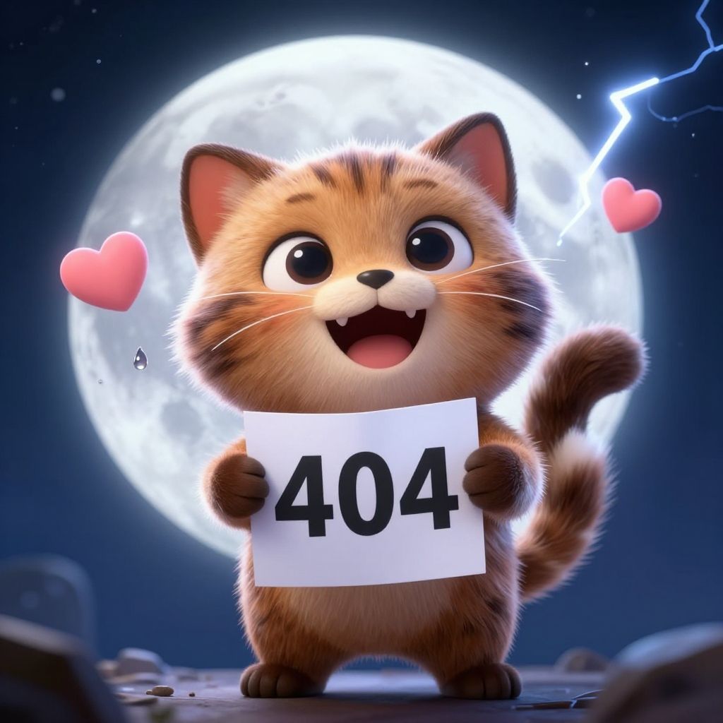 Cute CGI cartoon kitten with big eyes, orange and brown fur, holding "404" sign, against bright full moon with lightning and heart icons.