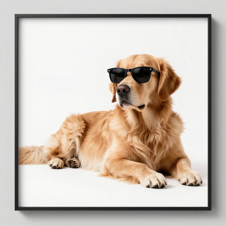 Photograph of a golden retriever lying down on a white background. The dog has a golden, fluffy coat and is wearing black, rectangular sunglasses. Its paws are positioned in front, and its head is slightly turned to the right, giving a calm and confident expression. The image is framed in a thin black frame, with a subtle shadow cast on the white surface behind it. The lighting is even, highlighting the dog's fur texture and the glossy finish of the sunglasses. The overall style is clean and minimalist.
