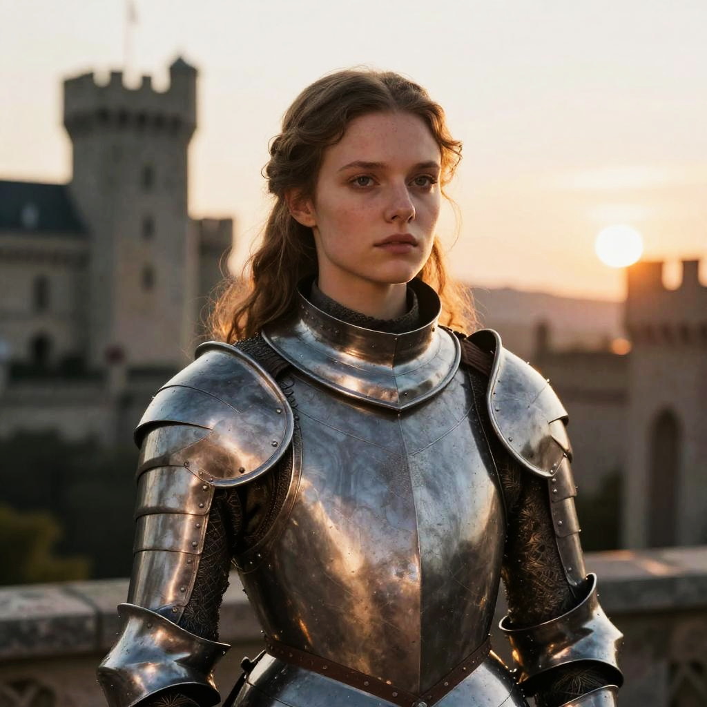 Photograph of a young woman with wavy brown hair, wearing shiny, reflective medieval steel armor with a detailed coat of arms on the chest plate. She has a serious expression and is standing in front of a blurred, stone castle with two cylindrical towers. The armor's metallic sheen catches the sunlight, highlighting its texture. The background is a clear, blue sky, and the overall scene suggests a historical or fantasy setting. The image has a realistic, cinematic style, with sharp focus on the woman and a soft focus on the background.