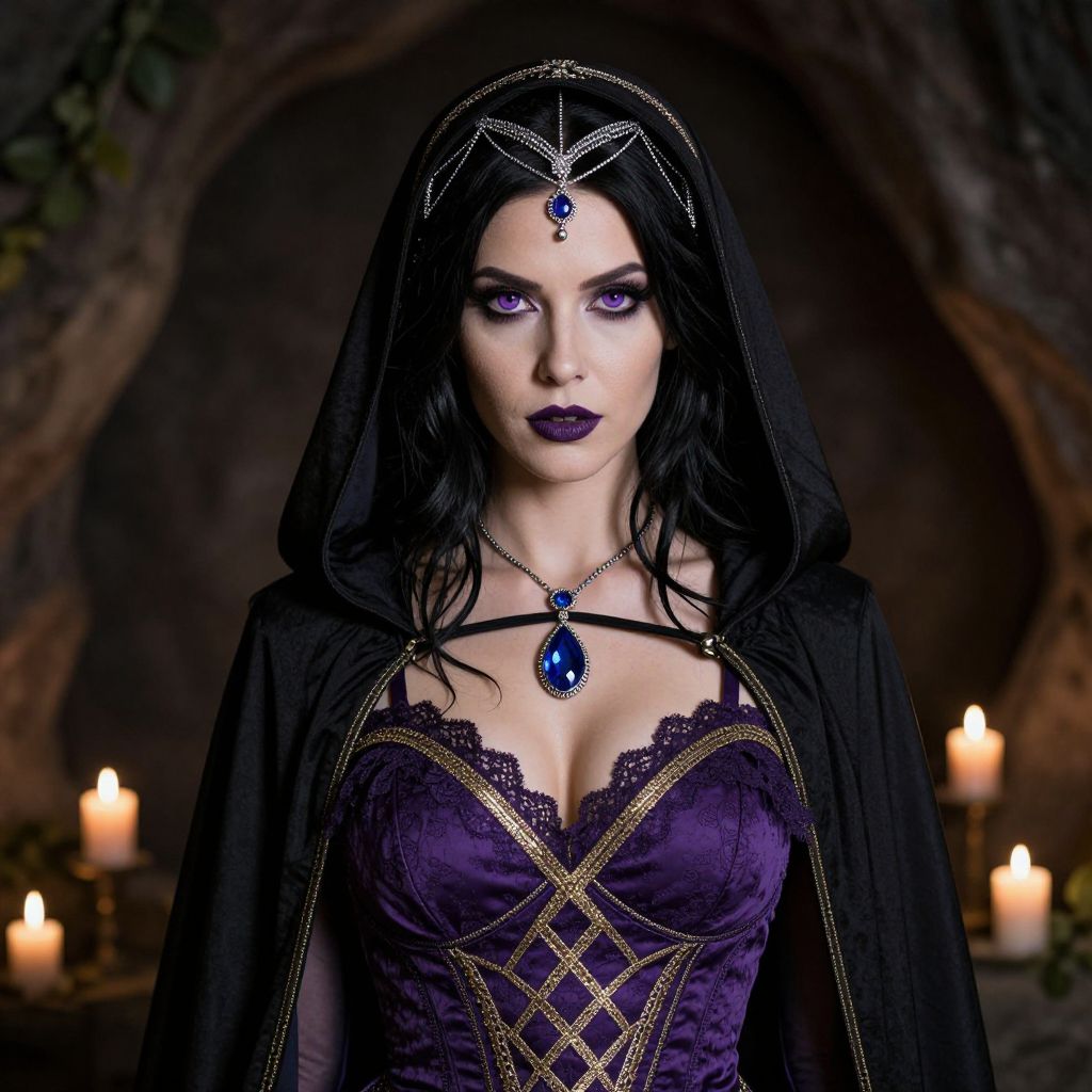 Photograph of a dark-haired woman with striking purple eyes, wearing a black hooded cape over a low-cut, lace-trimmed purple dress with gold geometric patterns. She has a blue gemstone necklace and a silver veil on her head. The background is a dimly lit cave with multiple lit candles and some greenery. Her makeup is dramatic, enhancing her intense gaze. The image has a fantasy, gothic vibe.