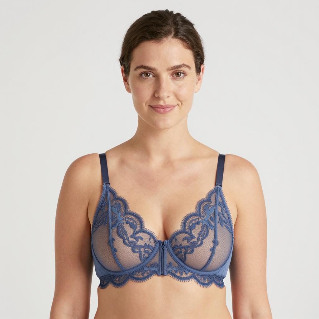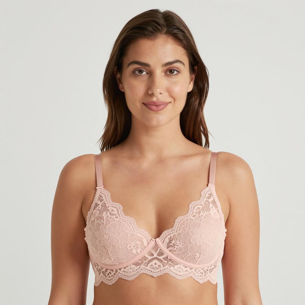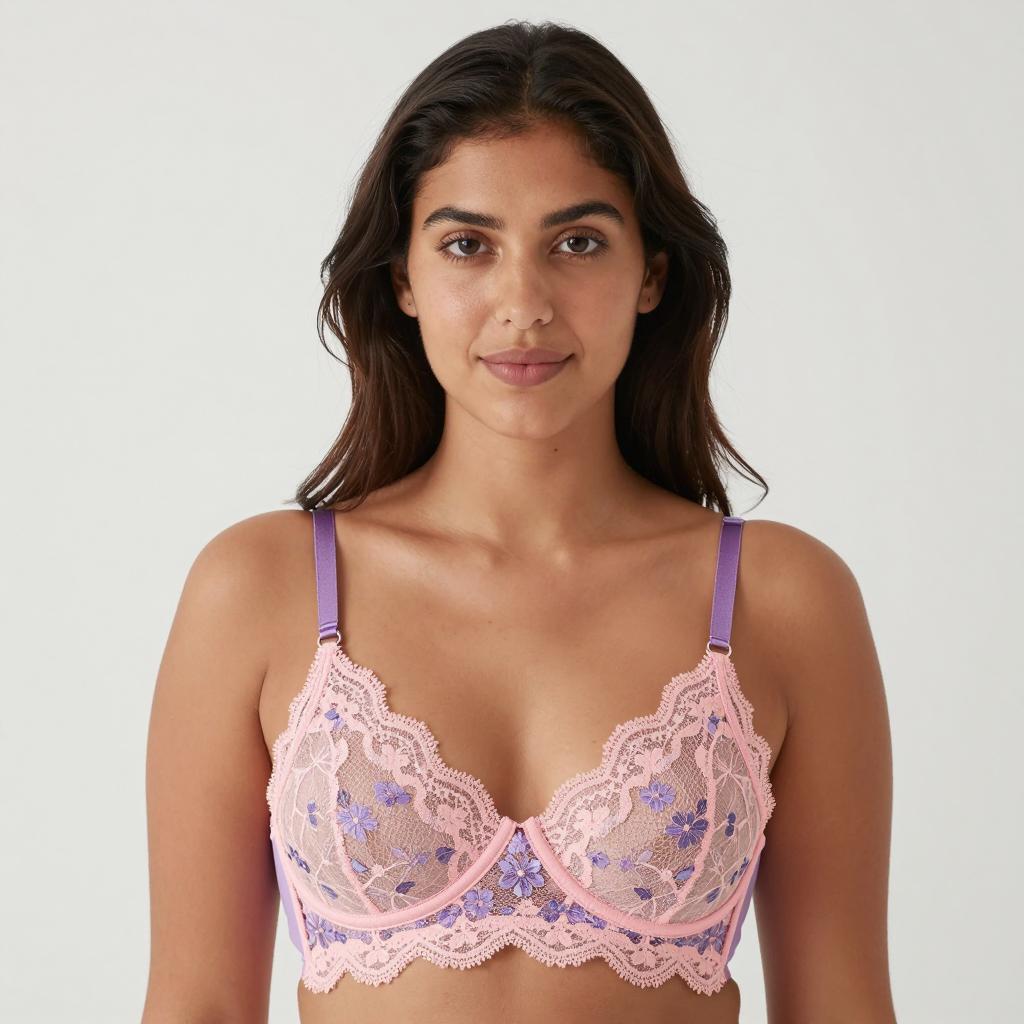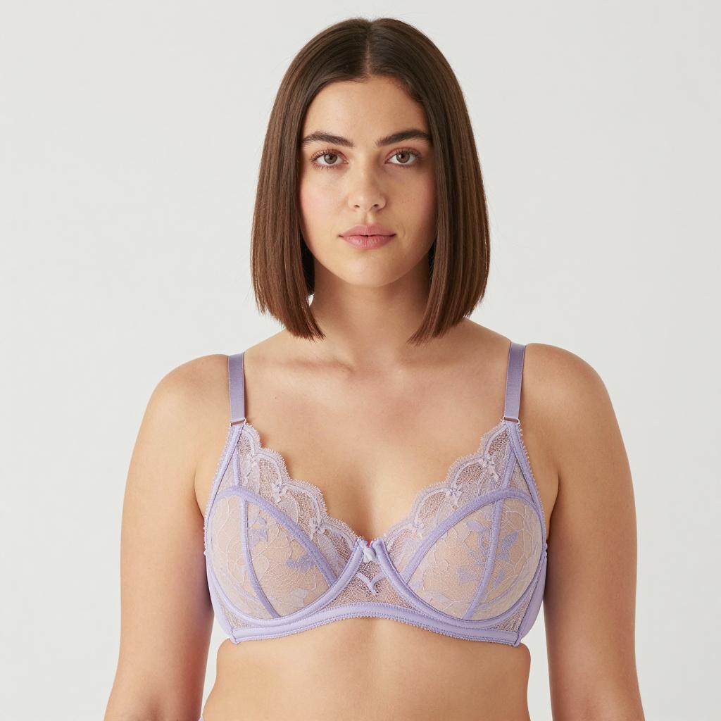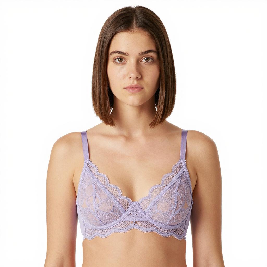 Young woman with straight brown bob haircut, fair skin, neutral expression, wearing a lavender lace-trimmed bra, centered in a white background. Upper body visible, bra fits snugly, small to medium-sized breasts, bra straps over shoulders.