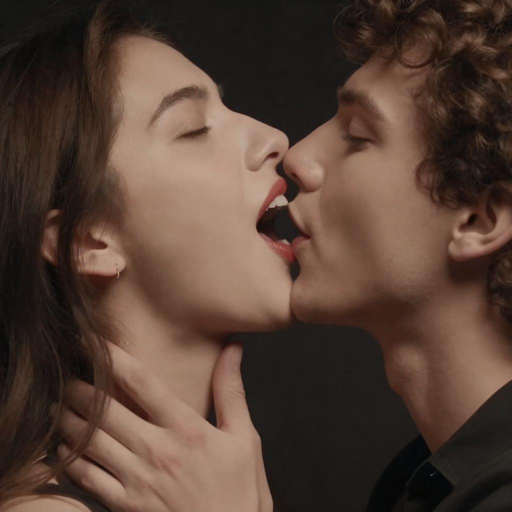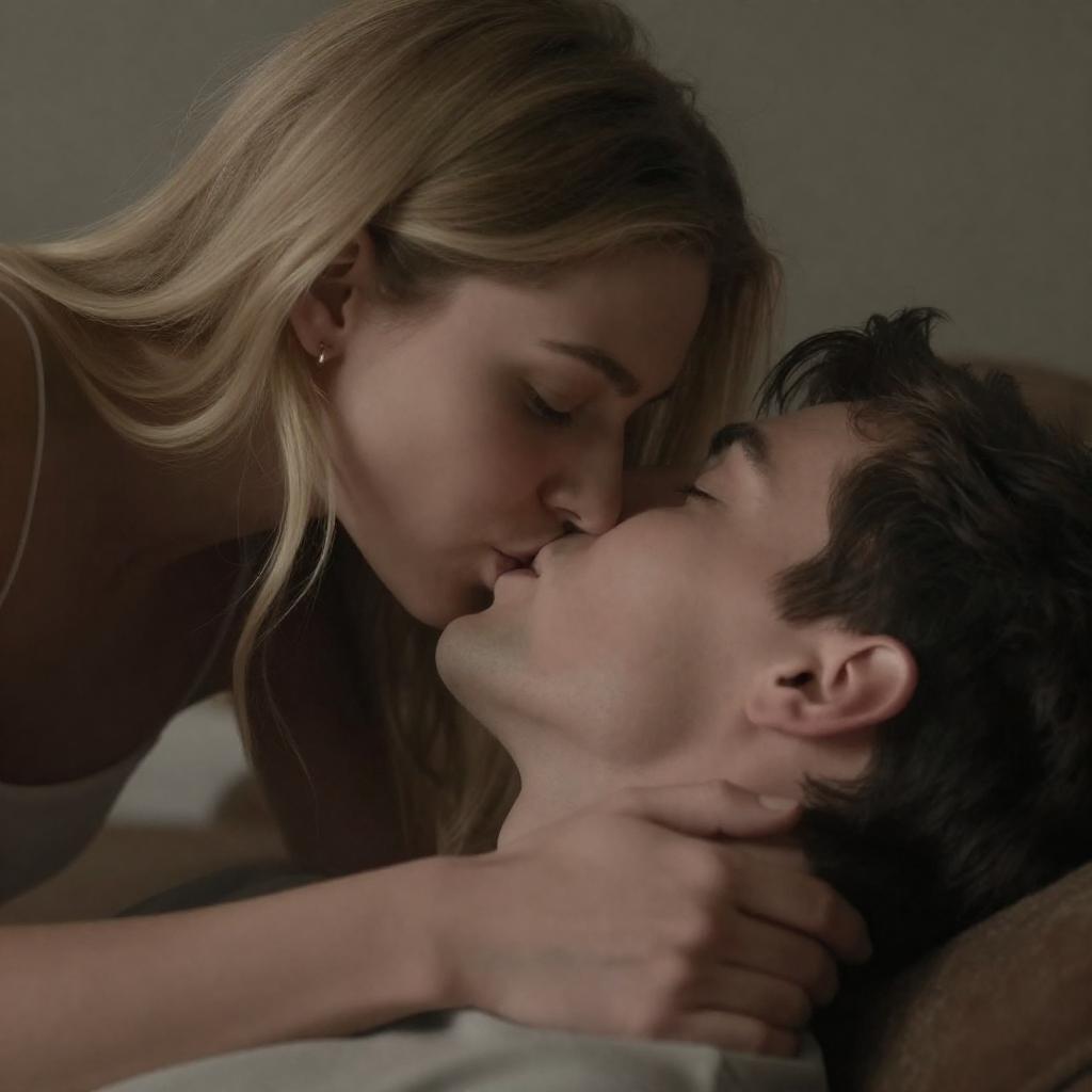 Close-up photo of a young blonde woman and a brown-haired man sharing an intimate kiss. The man gently holds the woman's face while both have their eyes closed. The woman has light skin, gentle eyes, and light makeup. The man has light skin and slight stubble. The background is neutral, emphasizing the tender moment between the couple.