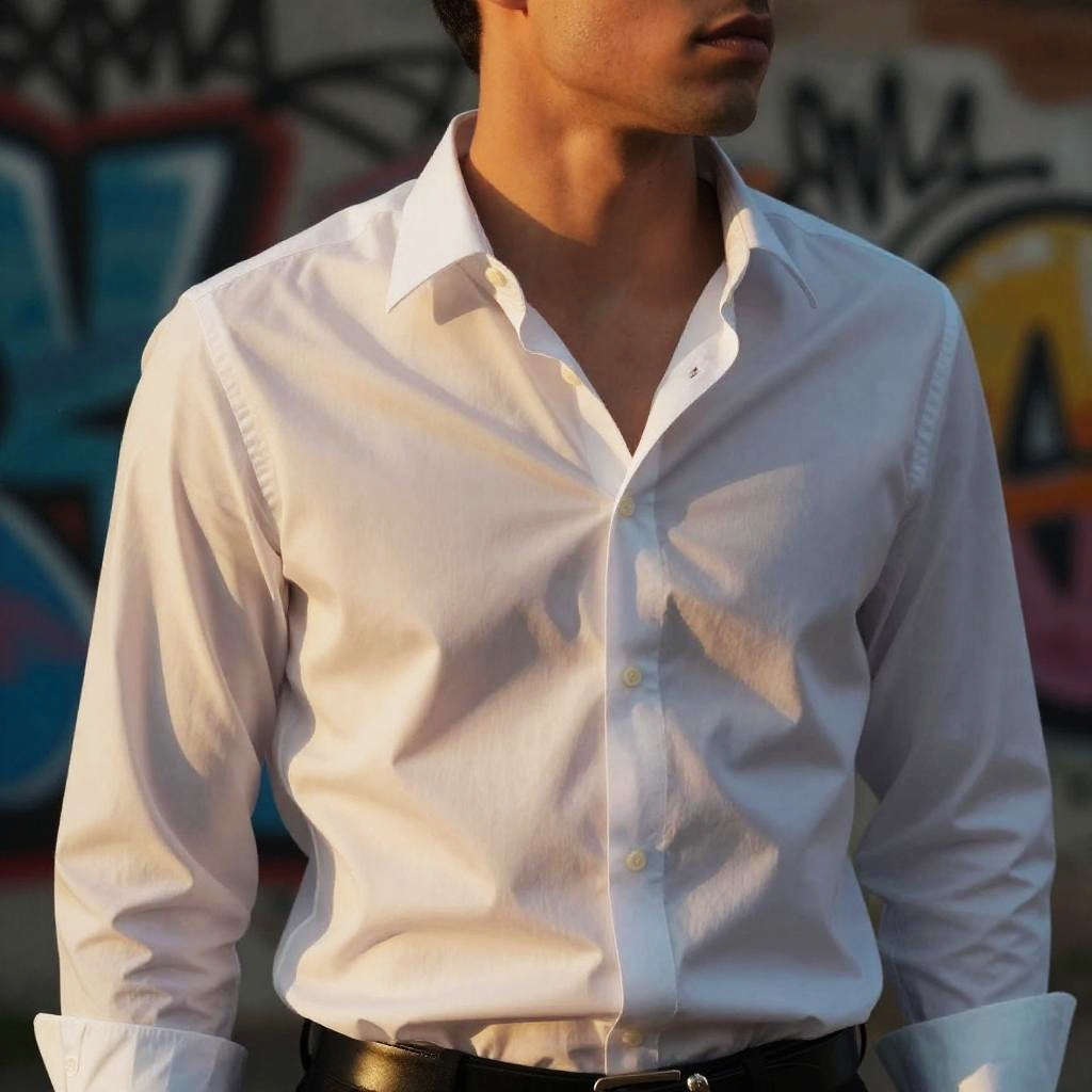 Dynamic street style scene with a dress shirt unbuttoned on a young man, graffiti background, sunset glow illuminating fabric textures and skin tones, cinematic color grading