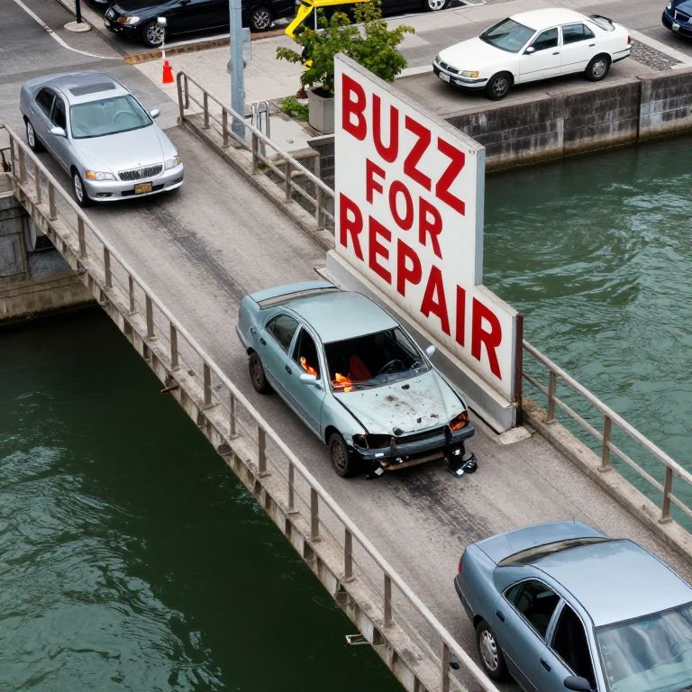 Microworldlora, image of small bridge from the top with a demolished car in the middle and a Big sign that says \"BUZZ FOR REPAIR\", old cars, that connect to part of a city day time, water under the bridge, a small fire inside the car, Big sign that says \"BUZZ FOR REPAIR\