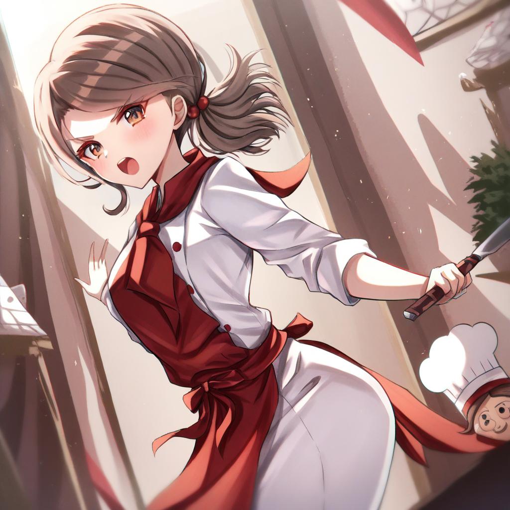 Illustration of a young anime chef with brown medium-length hair tied back, wearing a white chef uniform with a red apron and neckerchief. The character is holding a kitchen knife in a dynamic pose, set against a bright background with a small cartoon chef's head wearing a white chef hat visible in the corner.