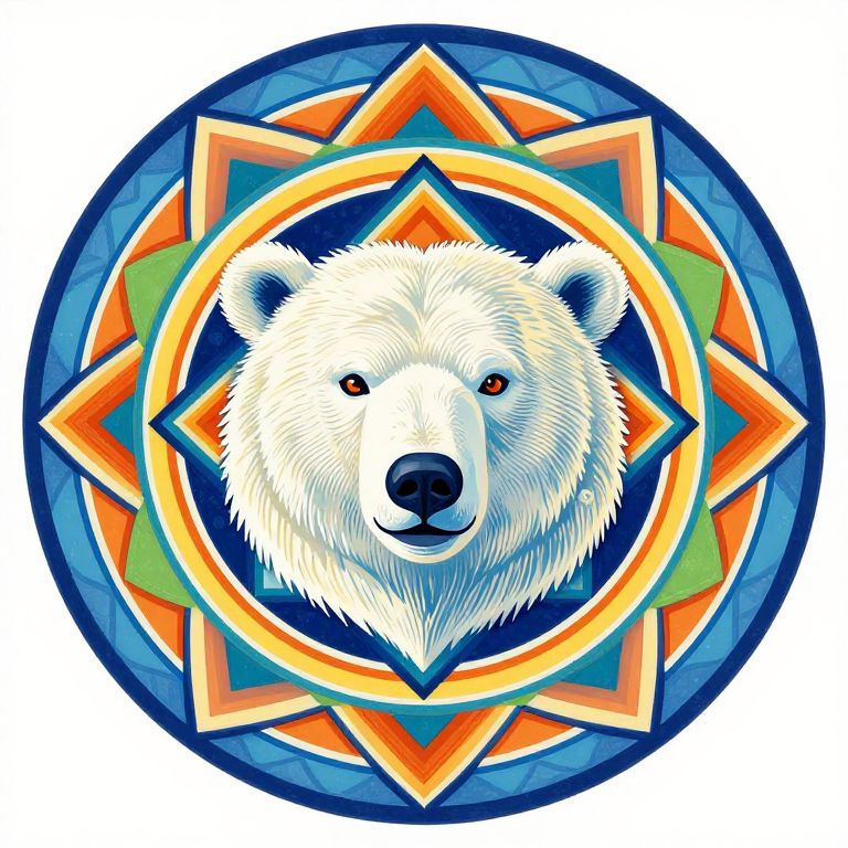 The image features a vibrant and intricately designed mandala with a polar bear head at its center. The mandala is composed of a series of concentric circles and geometric shapes, adorned with a variety of colors including shades of blue, green, orange, and yellow. The polar bear's head is detailed with fine lines and patterns, giving it a textured appearance. The bear's eyes are large and expressive, with a slight hint of a smile, adding a sense of warmth to the otherwise geometric design. The mandala's outermost circle is a deep blue, while the innermost circle contains a mix of colors, creating a visually striking contrast. The overall composition is balanced and harmonious, with the polar bear head positioned centrally, drawing the viewer's attention immediately. The interplay of colors and shapes creates a dynamic and engaging visual experience, making the image both aesthetically pleasing and thought-provoking.