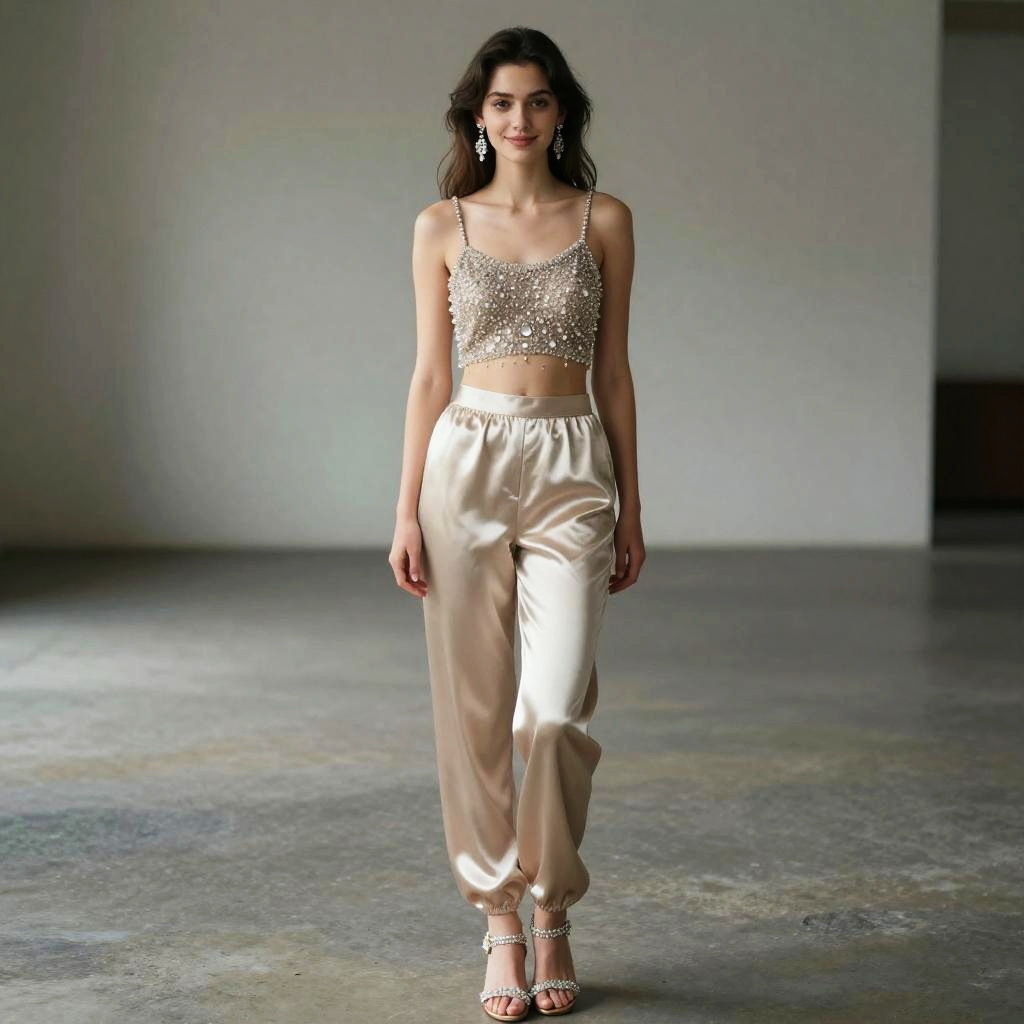 Photograph of a young woman with long, wavy dark hair walking on a grey concrete runway. She is wearing a sparkly, sleeveless crop top with thin straps and high-waisted, shiny beige satin pants that have a gathered waist. She accessorizes with dangling earrings and strappy beige high-heeled sandals. The background is a plain, light grey wall, creating a minimalist setting that emphasizes her outfit. The lighting is soft, highlighting the textures of her clothing. Her expression is calm, and she looks directly at the camera.