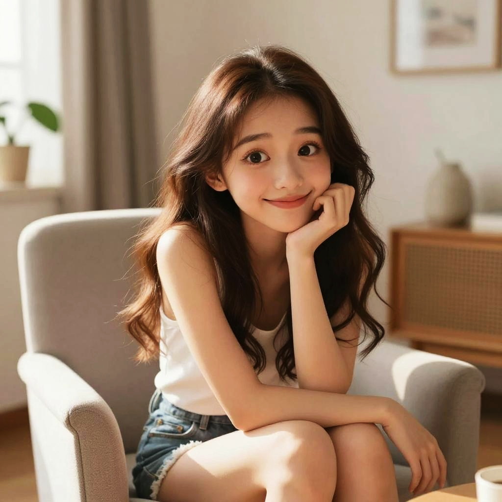 (masterpiece), (best quality), (ultra-detailed), (full body:1.2), medium shot, chibi, cute, morning light, indoor, at home, sitting on an armchair, side view, bokeh, oversaturated, color contra BREAK 1.1, ultra realistic, digital art, art station, (color contrast: 1.1), 1girl, 20 years old, smile, brown wavy long hair, brown eyes, different emotion, ultra realistic, digital art, ArtStation quality, high color contrast, young woman, 20 years old, warm smile, brown long wavy hair, brown eyes, expressive face, emotional variety