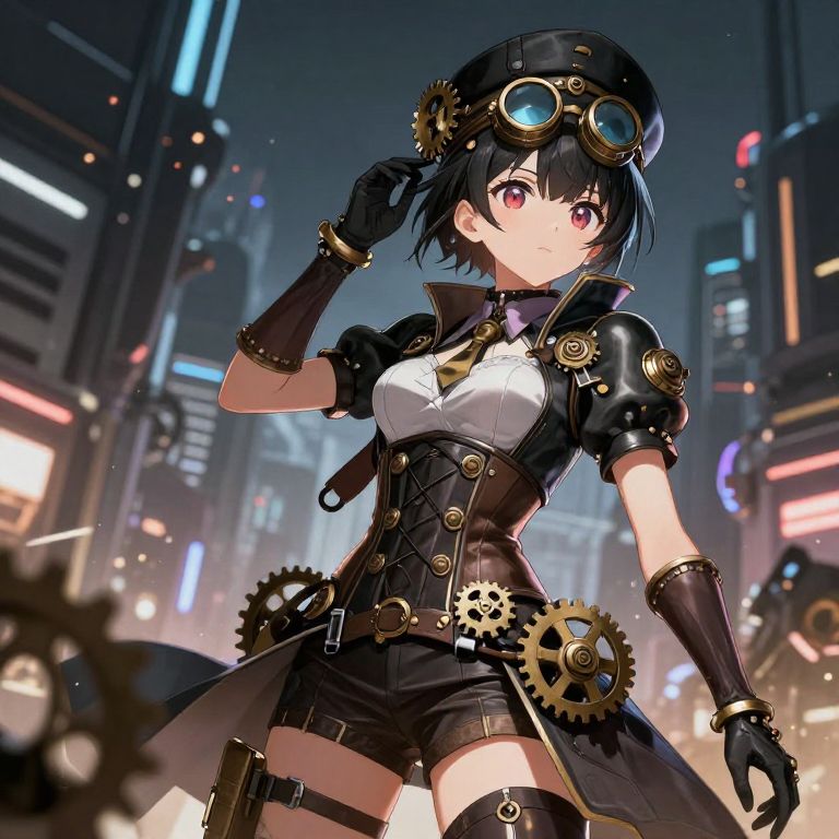 Digital illustration of a steampunk anime girl with orange hair, dressed in a dark Victorian-inspired outfit with intricate leather corset, bows, and gear accessories. The background features a mechanical steampunk frame and a townscape silhouette at sunset with warm orange hues.