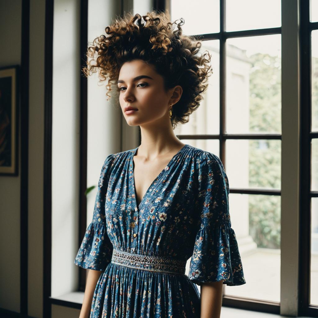 Curly Quiff hairstyle on female model, wearing bohemian maxi dress, in art gallery, captured in fashion editorial style with natural window light.