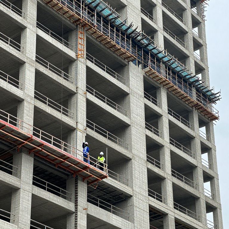 Photograph of a tall, unfinished concrete building with two construction workers in high-visibility vests on a mid-level scaffolding platform.