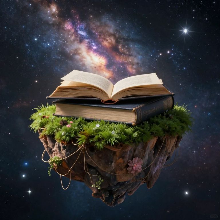 Books rest precariously atop a verdant, floating island suspended in a cosmic expanse, illuminated by a radiant nebula and surrounded by twinkling stars, as if tethered to the universe by the whispers of forgotten tales.