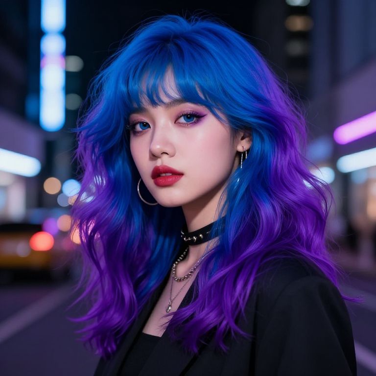 Try a new hair color with vibrant shades of electric blue and purple, styled in soft waves under neon city lights, a futuristic urban fashion vibe with bold makeup and edgy accessories.