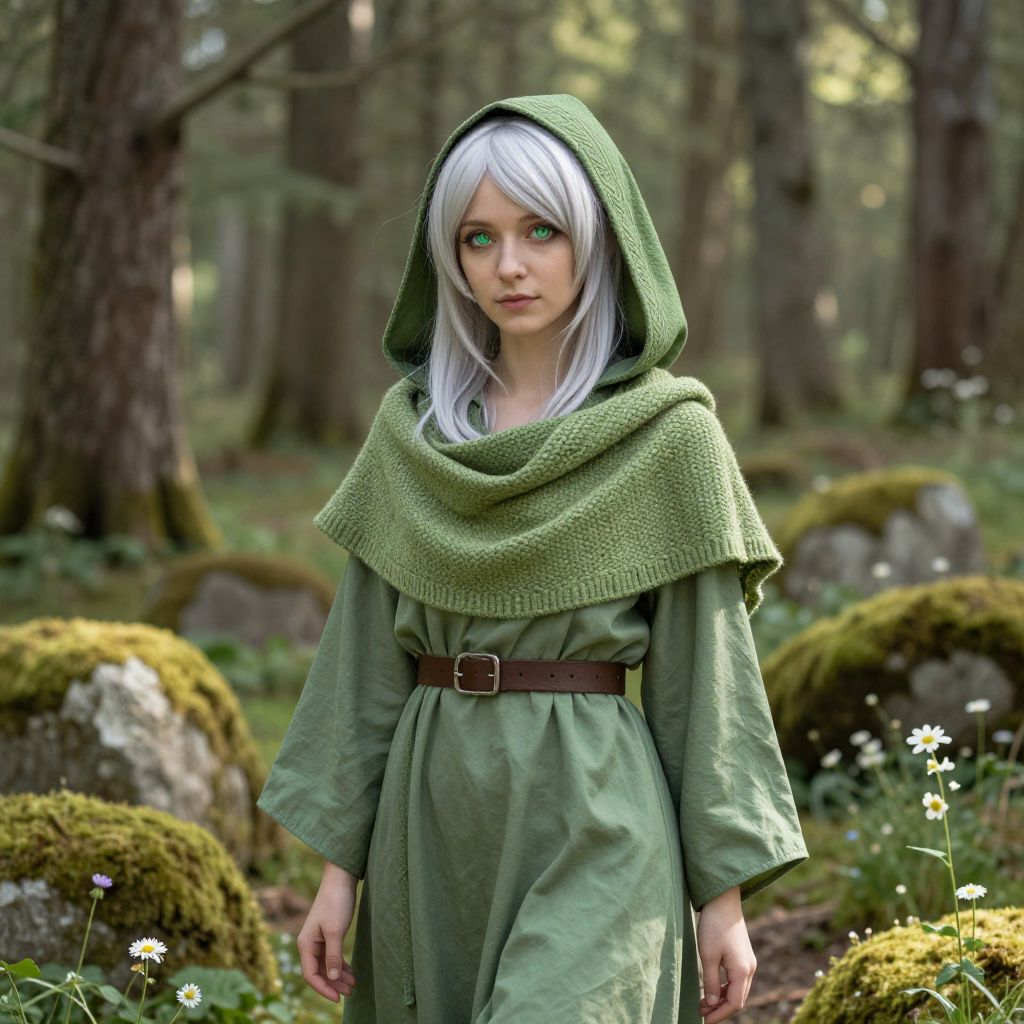 Photorealistic digital artwork of a young woman with pale skin and silver-white hair, standing in a lush forest. She wears a green hooded dress with a knitted green scarf, belted with a brown strap. Her large, green eyes are striking. The forest background features tall trees, moss-covered rocks, and small white flowers. The light filtering through the trees creates a serene, mystical atmosphere. Her expression is calm and slightly curious. The texture of her clothing is detailed, contrasting with the soft, natural forest setting.