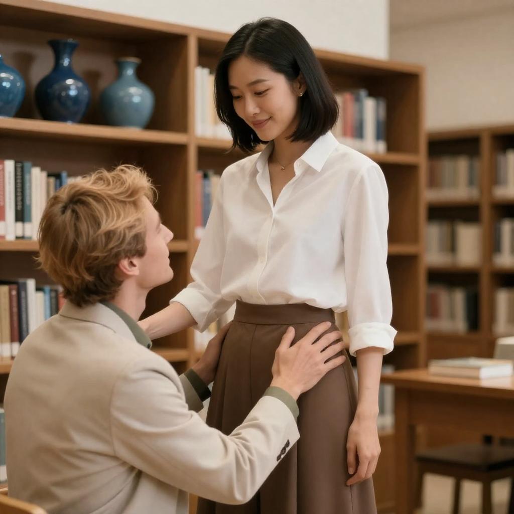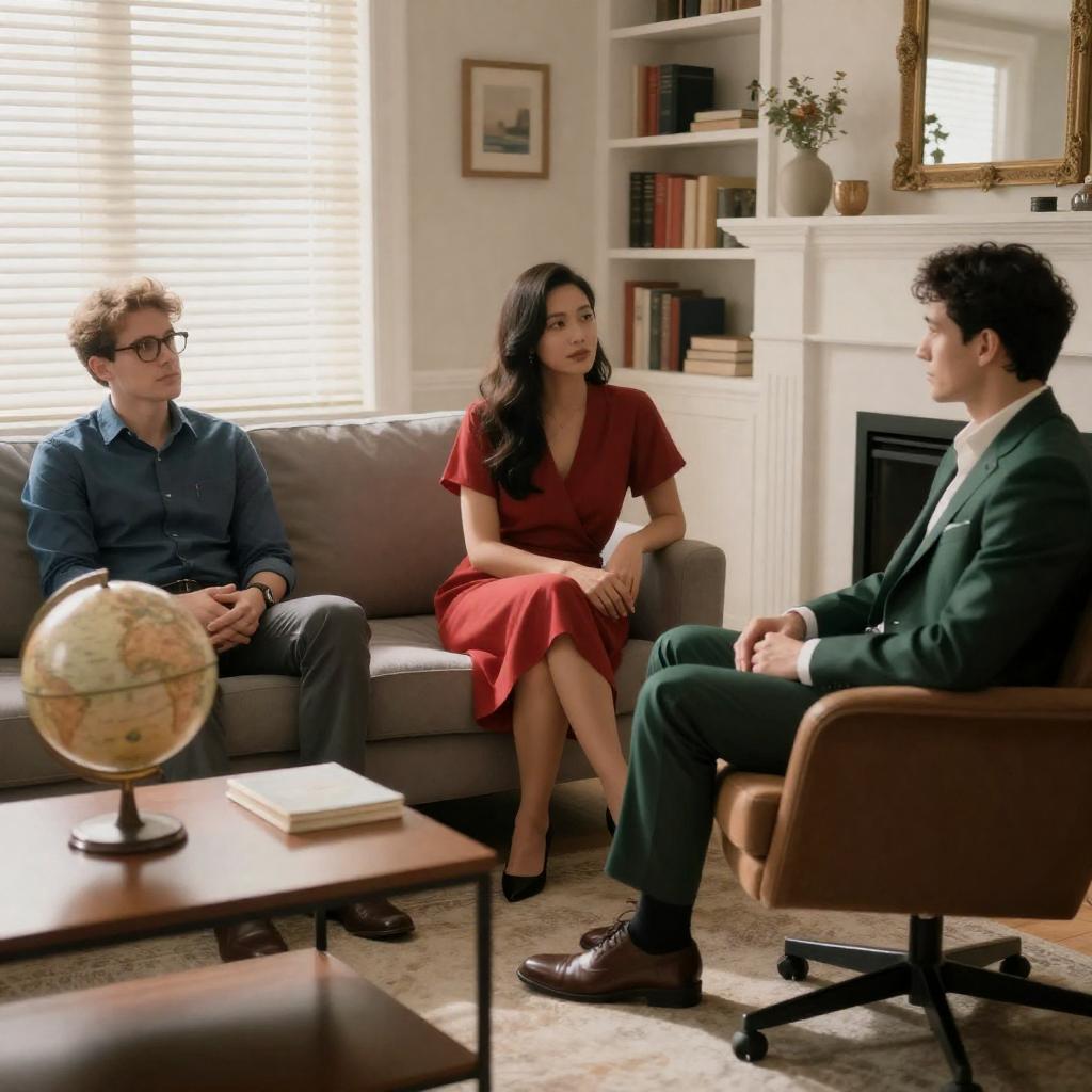 Photograph of three people in a grassy outdoor setting. A woman with dark hair reads a book inside a woven, spherical hanging chair. Two people stand in front of her, a red-haired woman in a white dress and a man in a white shirt and khaki shorts, both facing her. Green trees and grass in the background. The man looks at the red-haired woman, who looks at the woman in the chair.