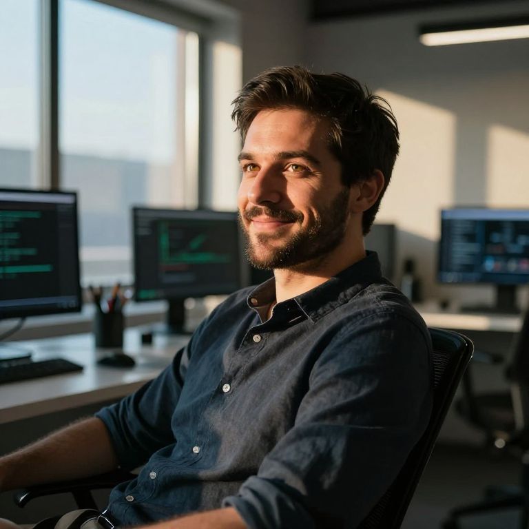 Imagine a captivating portrait of a 35-year-old male software engineer, featuring warm hazel eyes, short dark hair, and a neatly trimmed beard. His soft smile exudes friendliness and passion for his work. Captured in a moment of contemplation, he leans back in a sleek office chair, gazing thoughtfully off-camera. A ray of sunlight filters through the large window behind him, illuminating his face with a warm glow while casting dramatic shadows across the modern, technology-filled room. This interplay of light and shadow creates an emotional gradient, reflecting both introspection and inspiration. The portrait is a vivid testament to the harmonious balance between innovation and humanity.